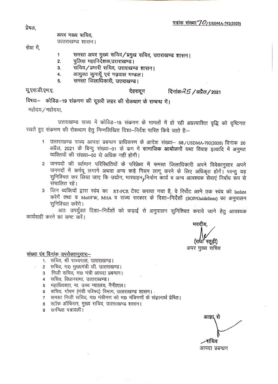 उत्तराखंड में बढ़ रहे कोरोना के बढ़ते मामलों को लेकर अपर मुख्य सचिव राधा रतूङी ने आदेश जारी किया है। उत्तराखंण्ड राज्य आपदा प्रबंधन प्राधिकरण के आदेश में अब शादी समारोह व सामाजिक आयोजनों में 50 से अधिक लोग शामिल नहीं हो पाएंगे। इसके साथ ही जिले के जिलाधिकारी अपने विवेकानुसार से जिले में कर्फ्यू लगाने या जिले में कड़े नियम लागू करने के लिए अधिकृत होंगे।