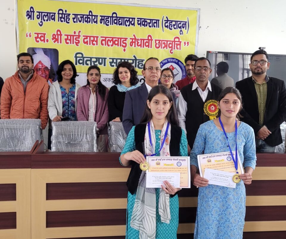 श्री गुलाब सिंह राजकीय महाविद्यालय चकराता में मेधावी विद्यार्थियों को ‘स्वर्गीय श्री साईं दास तलवाड़ छात्रवृत्ति’ दी गई। बुधवार को महाविद्यालय सभागार में आयोजित सम्मान समारोह में सर्वोच्च अंक प्राप्त विद्यार्थियों को प्राचार्य प्रोफेसर केएल तलवाड़ ने अपने स्वर्गीय पिता श्री साईं दास तलवाड़ की स्मृति में नकद धनराशि भेंट की।इससे पूर्व भी दो सत्रों में तीन-तीन टाॅपर्स को यह छात्रवृत्ति दी जा चुकी है।कार्यक्रम में बीए छठे सेमेस्टर की टाॅपर आंचल तोमर को ₹ 3100/- तथा बीए द्वितीय वर्ष की टाॅपर नेहा तोमर को ₹ 2100/- की नकद धनराशि के साथ मैडल एवं प्रशस्तिपत्र दिया गया। कार्यक्रम का संचालन करते हुए समारोह क डा.सुमेर चंद ने बताया कि उत्तरकाशी निवासी स्व.श्री साईं दास तलवाड़ स्वयं भी अध्ययनप्रेमी व समाजसेवी रहे हैं। इसीलिए उनके नाम पर यह छात्रवृत्ति शुरू की गई है। प्राचार्य प्रोफेसर तलवाड़ और समस्त महाविद्यालय परिवार ने छात्रवृत्ति पाने वाले विद्यार्थियों को शुभकामनायें दी। कार्यक्रम में पीटीए अध्यक्ष बलबीर सिंह तोमर, परीक्षा प्रभारी डा.नरेश चौहान, डा.आराधना भंडारी,डा.जयश्री थपलियाल,डा.स्वाति शर्मा,डा.पवन भट्ट, डा.पूजा रावत, प्रधान सहायक रोशन लाल, अंकुर शर्मा,रोशन बख्श,शफीक मौहम्मद, अर्जुन सिंह व विनोद जोशी सहित बीए प्रथम सेमेस्टर के विद्यार्थी मौजूद रहे।