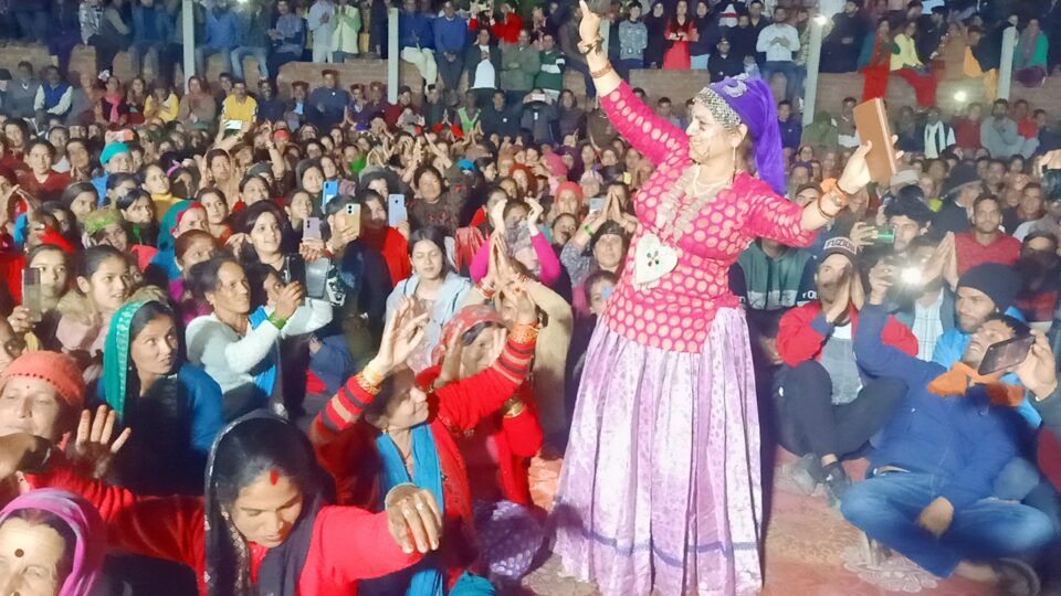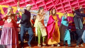 खरशाली गाँव मे आयोजित सास्कृतिक संध्या में स्थानीय लोगो के साथ विदेशी महिलाएं भी मंच पर जमकर झूमे।