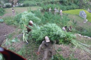 *पुलिस उपाधीक्षक ऑपरेशन प्रशान्त कुमार, उप जिलाधिकारी बृजेश कुमार तिवारी एवं वन क्षेत्राधिकारी प्रदीप बिष्ट के नेतृत्व में पुलिस-प्रशासन व वन विभाग की संयुक्त टीम द्वारा पट्टी गाजणा के सिरी गांव, गांव से ऊपर करीब 3-4 किमी0 पैदल छानियों में व कोनगढ़ में ग्रामीणों द्वारा बडे स्तर पर उगाई गयी भांग की खेती को नष्ट किया गया। कल 30.09.2023 को देर सायं तक चली विनष्टीकरण की कार्यवाही में पुलिस-प्रशासन की टीम द्वारा करीब 300 नाली भू-भाग पर पैदा की गयी भांग की खेती को नष्ट किया गया।* मौके पर आस-पास के क्षेत्रों में *ड्रोन से फोटो/ विडियो ग्राफी भी की गयी,* राजस्व की टीम द्वारा जमीन के रिकार्ड व फसल की पैदावार करने वालों की जानकारी की जा रही है, मामले में अग्रिम कार्यवाही प्रचलित है।