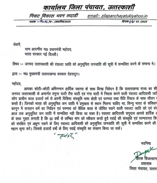 दीपक बिजल्वाण ने पीएम मोदी को लिखे पत्र में मांग की है कि जनपद उत्तरकाशी सीमांत जनपद है और यह क्षेत्र ओबीसी के रवांल्टा समुदाय के अंतर्गत आता है अब इस क्षेत्र को जनजाति घोषित किया जाये।