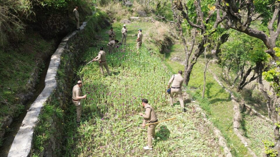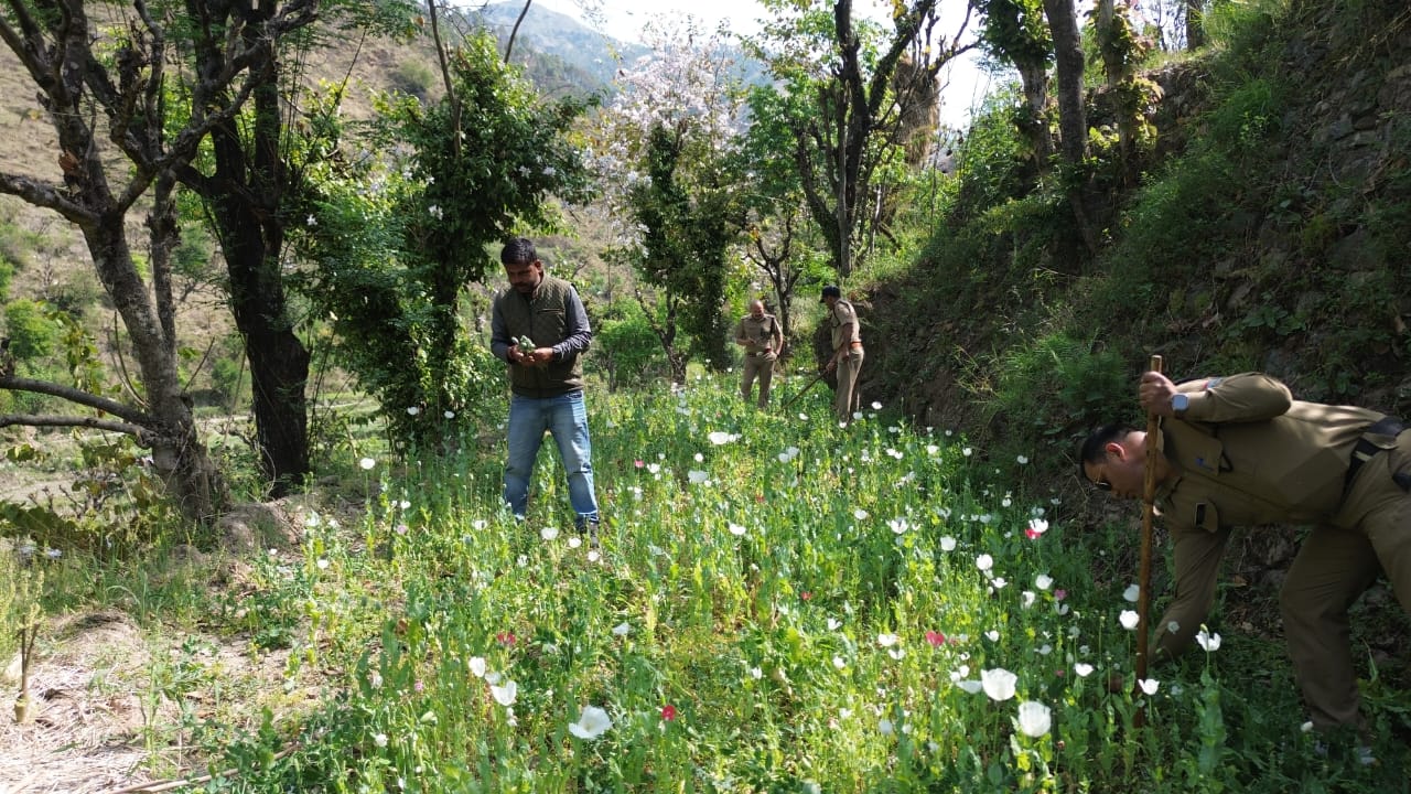 ड्रग्स फ्री देवभूमि मिशन के अन्तर्गत पुलिस अधीक्षक उत्तरकाशी के निर्देशन उत्तरकाशी पुलिस द्वारा चलाये जा रहे नशामुक्त के तहत जनपद पुलिस द्वारा अवैध कारोबार/नशीले पदार्थो का जड से खात्मा करने के लागातार प्रयास किये जा रहे हैं। थाना पुरोला पुलिस व एसओजी की संयुक्त टीम द्वारा एक सटीक जानकारी जुटाते हुये आज 11.04.2025 को थाना पुरोला क्षेत्रान्तर्गत स्थित गांव बिजोरी, सेमलसारी के बर्नी खुशियाबाग तोक के बजलाडी, पमाडी छानियों/क्यारियों छापेमारी कर करीब 0.3 हेक्टेयर (15 नाली) भू-भाग पर पैदा की गयी प्रतिबन्धित अफीम / पोस्त की खेती का विनिष्टीकरण किया गया।