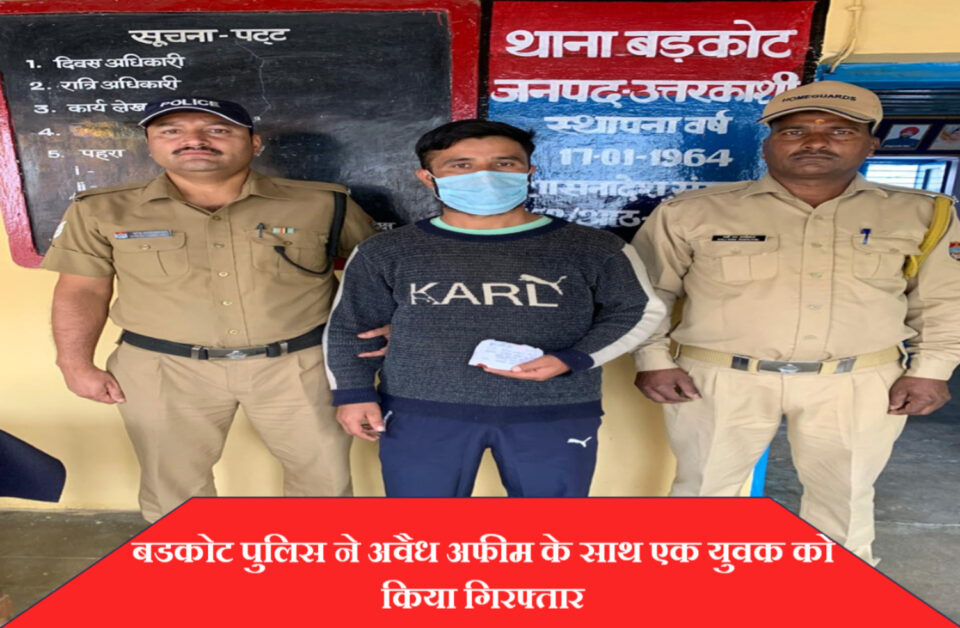 बड़कोट।ड्रग्स फ्री देवभूमि मिशन -2025 के अंतर्गत चलाये जा रहे नशामुक्त अभियान के तहत पुलिस अधीक्षक ने अवैध मादक पदार्थ/द्रव्य की तस्करी, व्यापार में संलिप्त तस्करों के विरूद्ध कठोर कार्यवाही किए जाने एवं धरपकड़ किए जाने हेतु निर्देशित किया गया था जिसके अनुपालन में क्षेत्राधिकारी बडकोट महोदय के निकट पर्यवेक्षण तथा थानाध्यक्ष बडकोट दीपक कठैत*के नेतृत्व में बडकोट पुलिस द्वारा एक अफीम तस्कर को गिरफ्तार किया गया है।