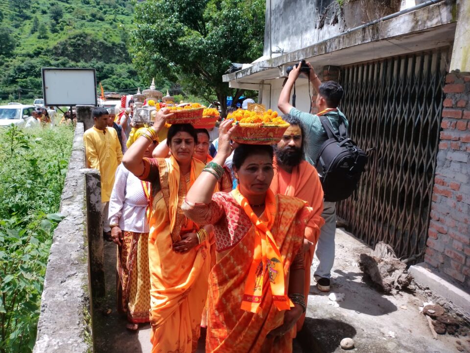 उपराडी गांव शनिवार को बड़ी संख्या में गांव की ध्याणी एकत्र हुए। इस दौरान उन्होंने बाबा बौखनाग के सांध्य में भव्या कलश यात्रा निकाली। कलश यात्रा गंगनानी पहुंची। वहां उन्होंने मां गंगा के साथ ही गणेश की मूर्ति और सोने के छत्र की विशेष पूजा अर्चना की। इसके साथ ही कलश यात्रा पुनः उपराडी गाँव पहुंची। जिसके बाद उन्होंने कलश स्थापित कर बाबा बौखनाग ओर मां भगवती की पूजा अर्चना की। इसके ध्याणी ने देव डोलियों के साथ तांदी नृत्य किया। ध्याणी समिति की अध्यक्ष कृष्णा बिजल्वाण ने बताया कि उपराड़ी गांव में दो दिन का ध्याणी मिल कार्यक्रम का आयोजन हो रहा। पहले दिन ध्याणी ने गंगनानी तक कलश यात्रा निकाली। वहीं दूसरे दिन समापन पर ध्याणी की ओर से बाबा बौखनाग के लिए सोने की गणेश की प्रतिमा ओर मां भगवती के लिए सोने के छत्र भेंट किया जाएंगे। इस मौके पर शांति प्रसाद बेलवाल, मोहन बेलवाल, पृथ्वी पाल सिंह, महिमानंद, प्रेमसागर डोभाल, भरत मणि बेलवाल, कविता, राजू ,मोहित, बाल कृष्ण,राधेकृष्ण सहित दर्जनों महिलाएं आदि मौजूद थे।