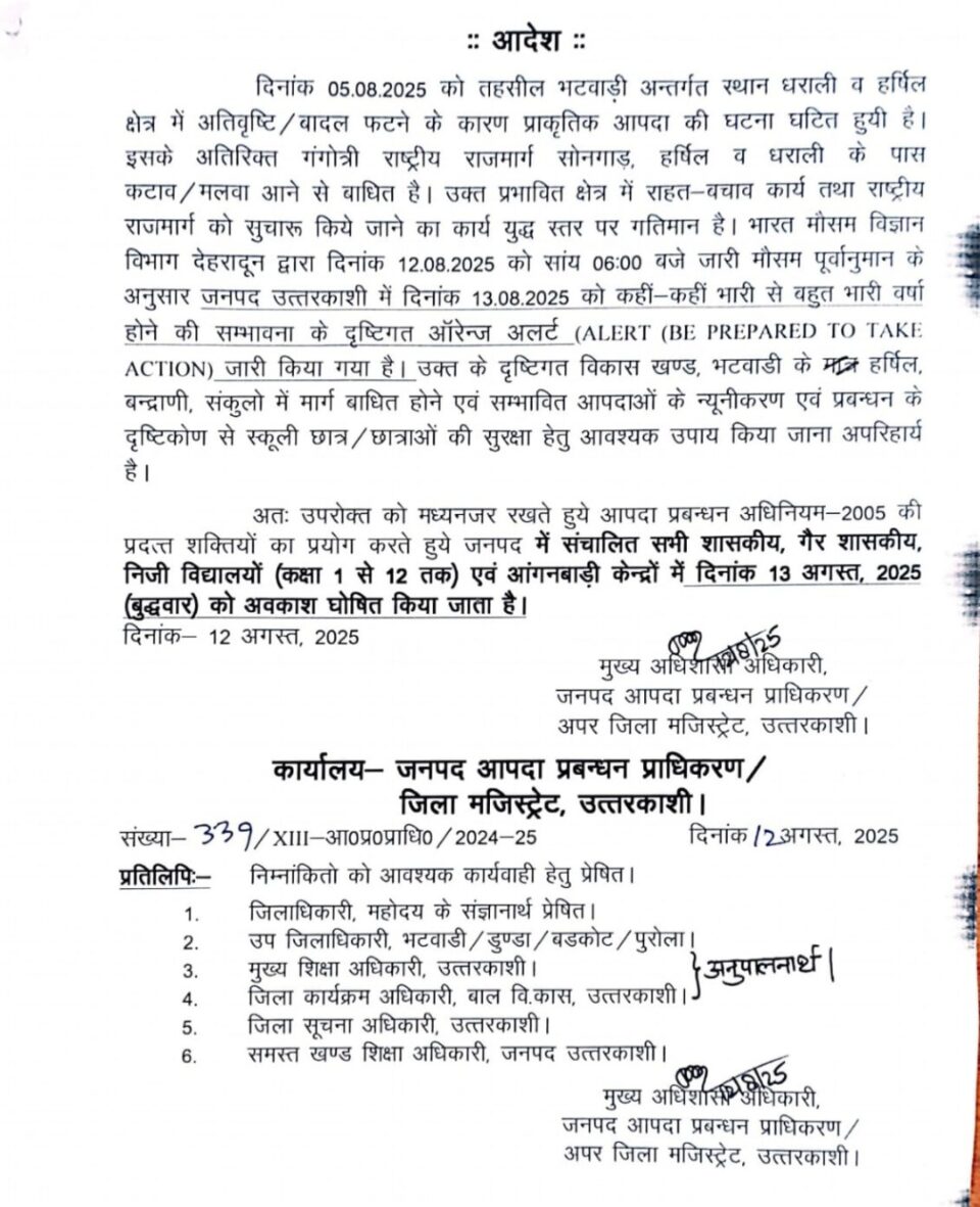 जिसमें जनपद उत्तरकाशी में सभी स्कूल कालेज बंद करने के आदेश जारी हुये हैं।