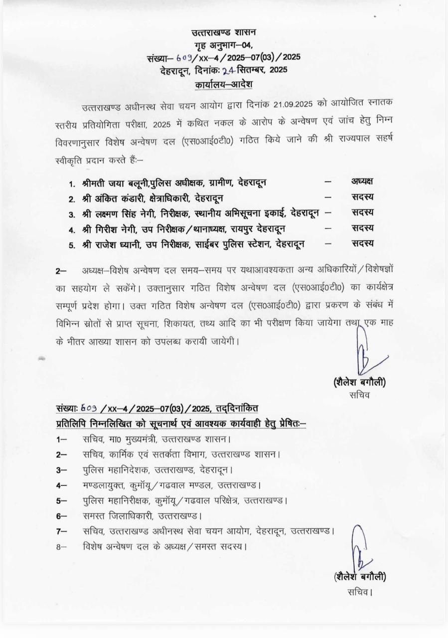 देहरादून। उत्तराखण्ड अधीनस्थ सेवा चयन आयोग द्वारा 21 सितम्बर को आयोजित स्नातक स्तरीय प्रतियोगिता परीक्षा, 2025 में कथित नकल के आरोपों की जांच के लिए विशेष अन्वेषण दल (एसआईटी) का गठन किया गया है। इस संबंध में श्री राज्यपाल ने सहर्ष स्वीकृति प्रदान की है।